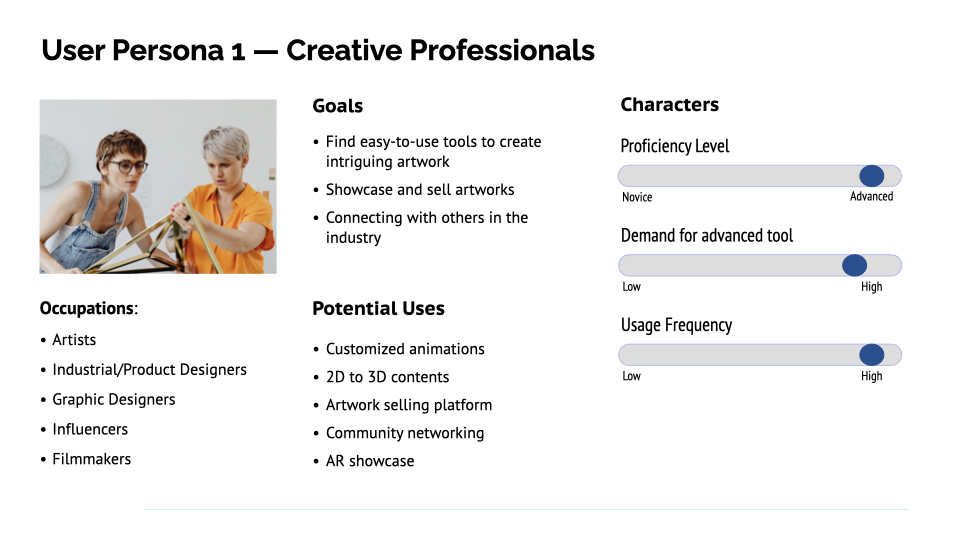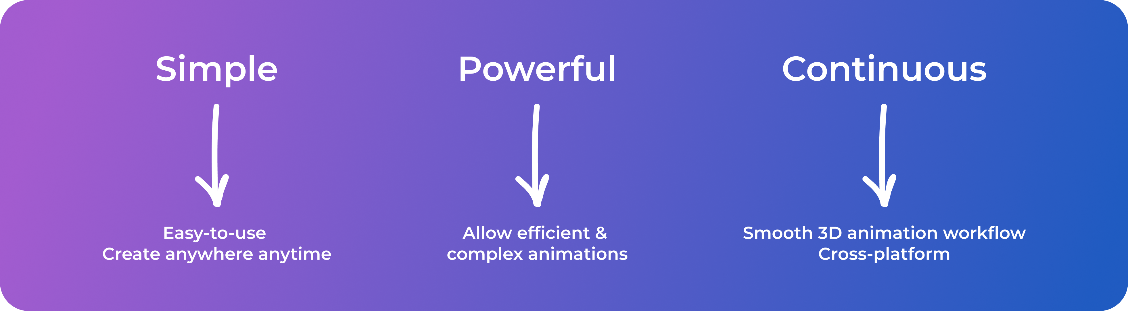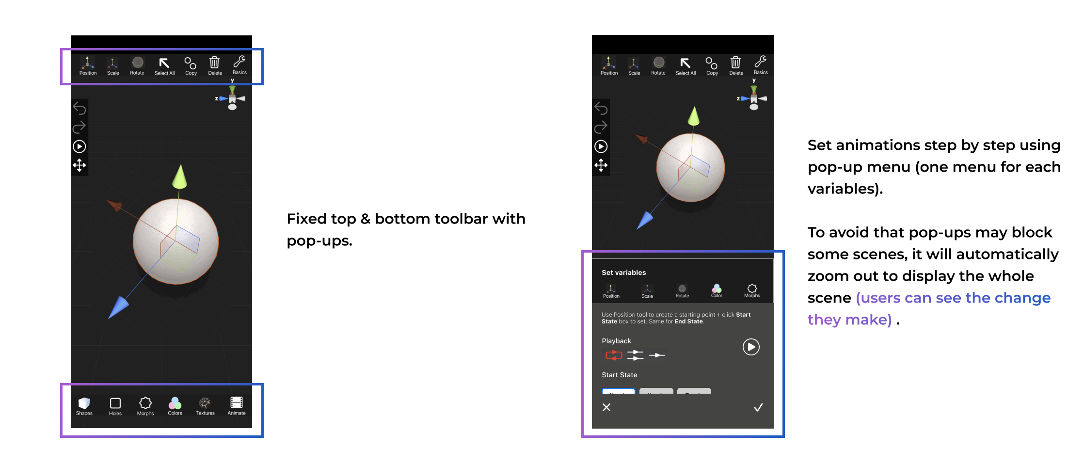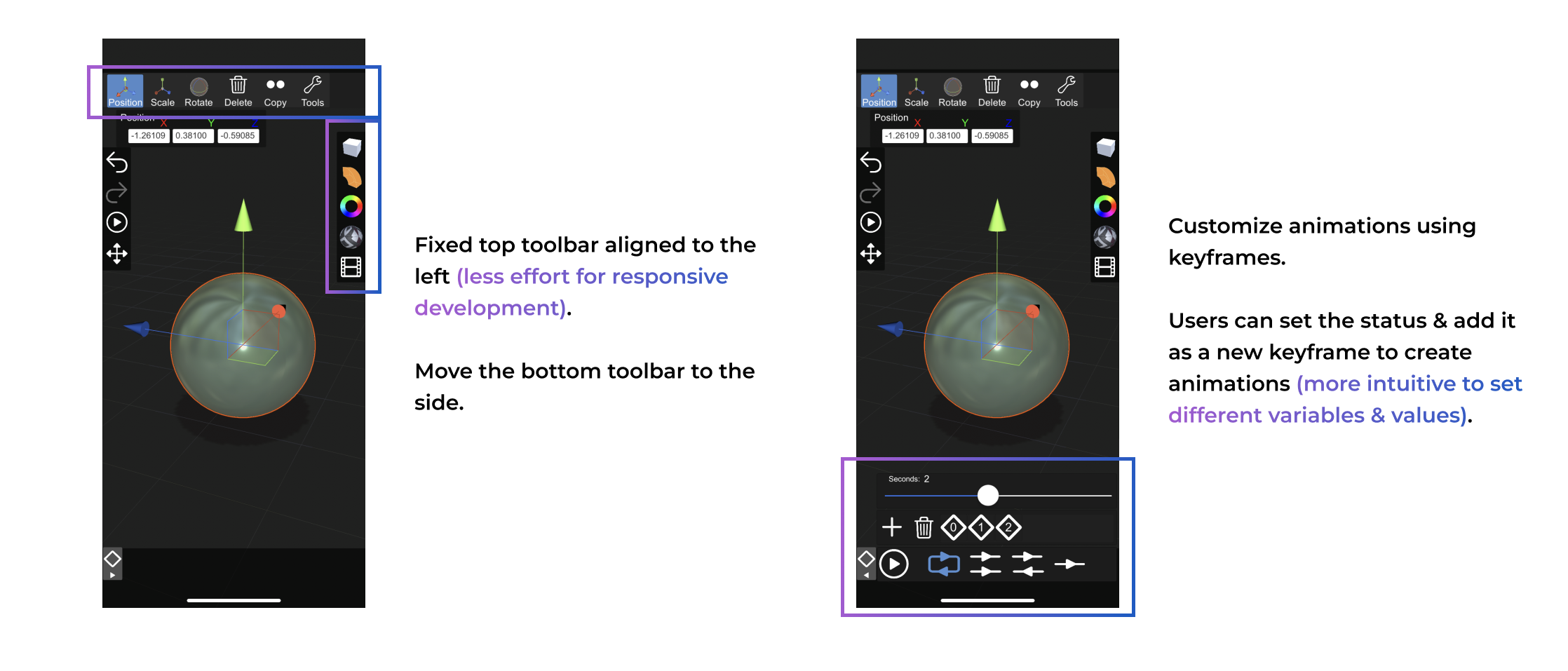 Instead of inputting values to animate, we use keyframes for animations. Users can add & set the status of each keyframe easily, and there will be smooth transitions automatically. Users can also adjust the speed using a slider.